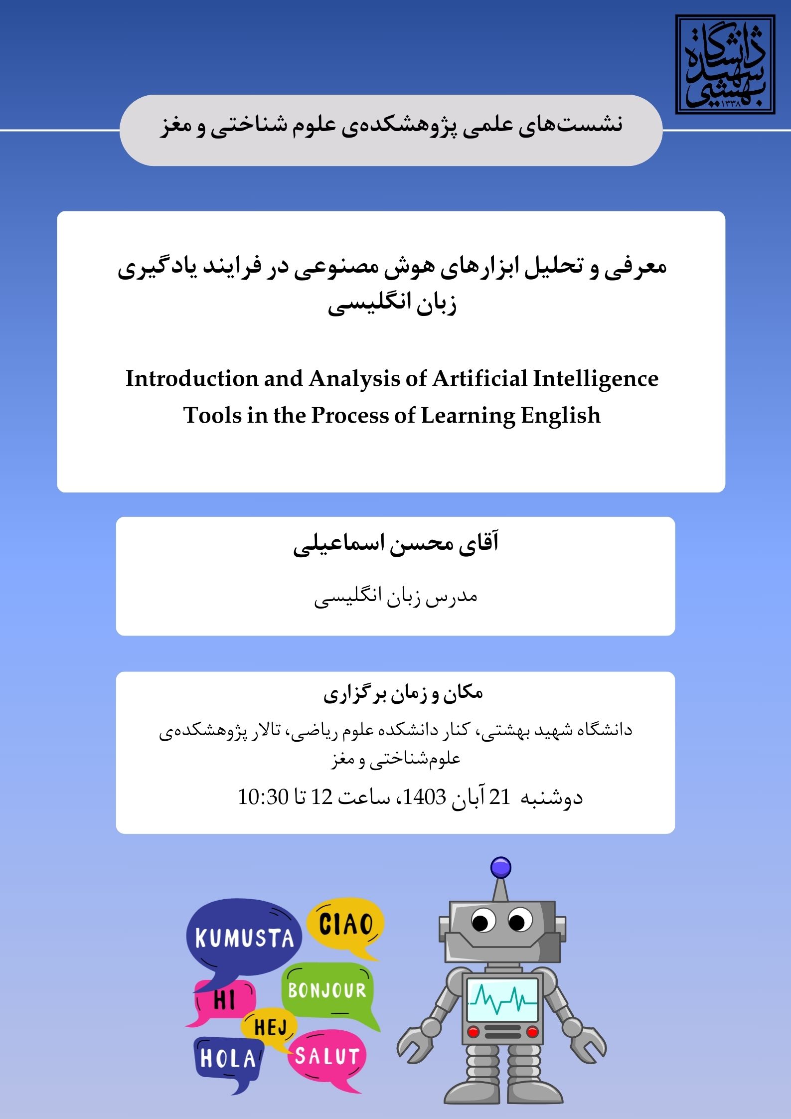 مکان : دانشگاه شهید بهشتی، تالار پژوهشکده علوم شناختی و مغز، جنب دانشکده علوم ریاضی