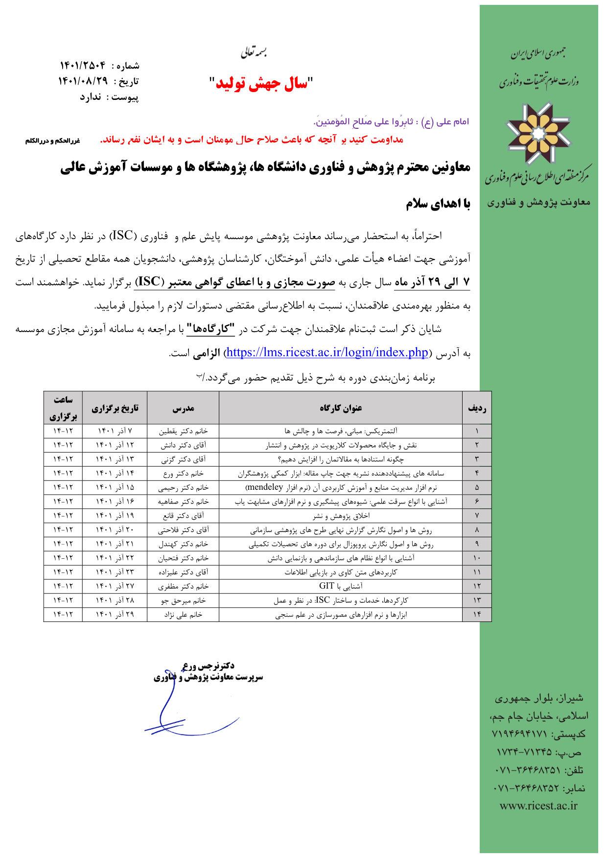 برگزاری " کارگاههای آموزشی موسسه استنادی جهان اسلام (ISC)"