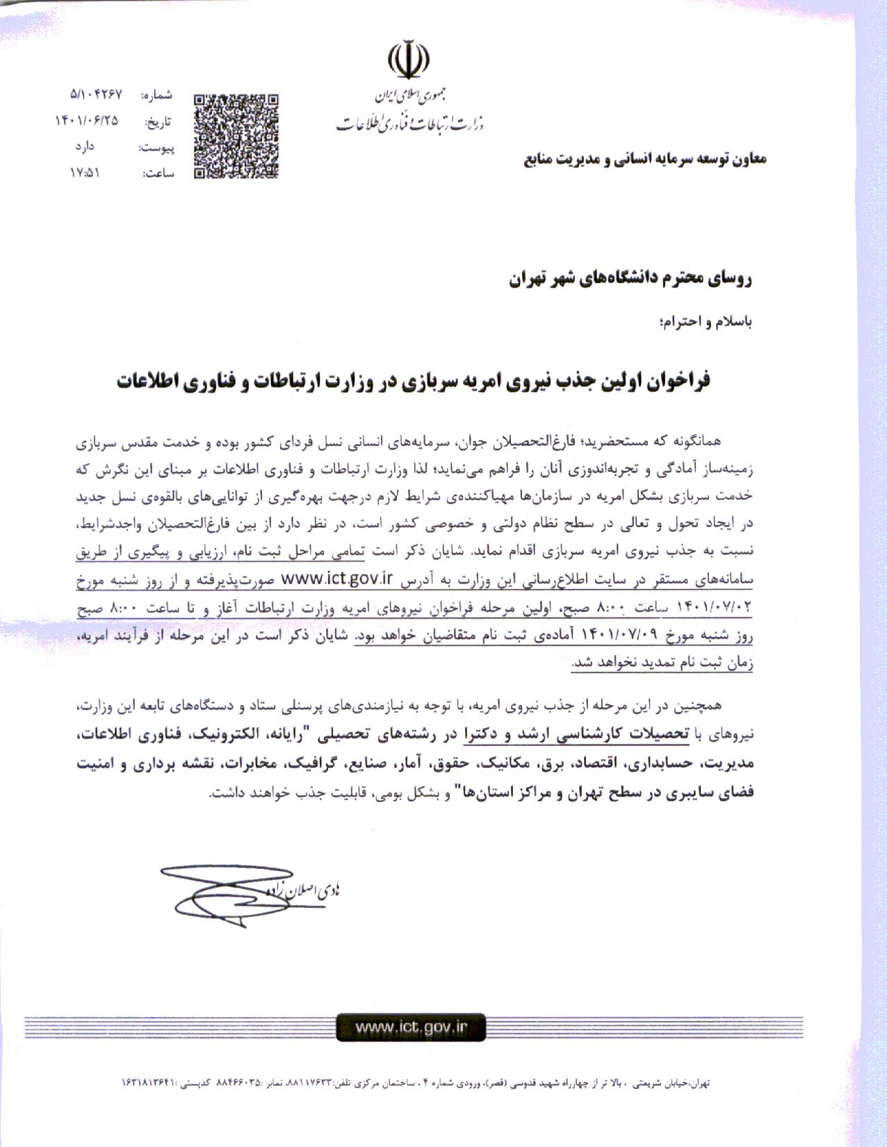 دانشجویان و دانش آموختگان گرامی، نامه در خصوص فراخوان جذب نیروی امریه سربازی در وزارت ارتباطات و فناوری اطلاعات پیوست می باشد. برای اطلاعات بیشتر به سایت www.ict.gov.ir مراجعه فرمایید.