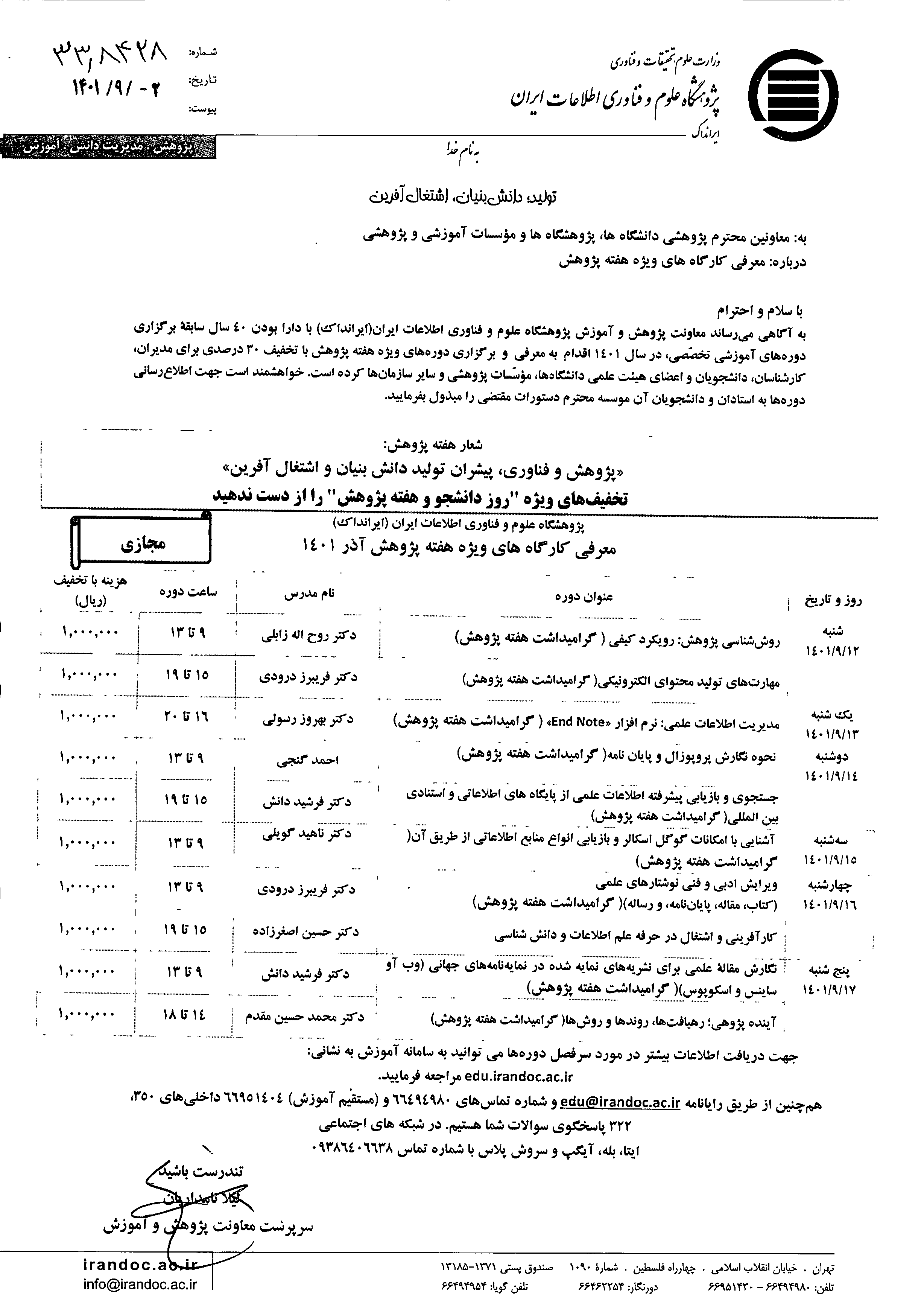 معرفی کارگاه های ویژه هفته پژوهش / ایرانداک