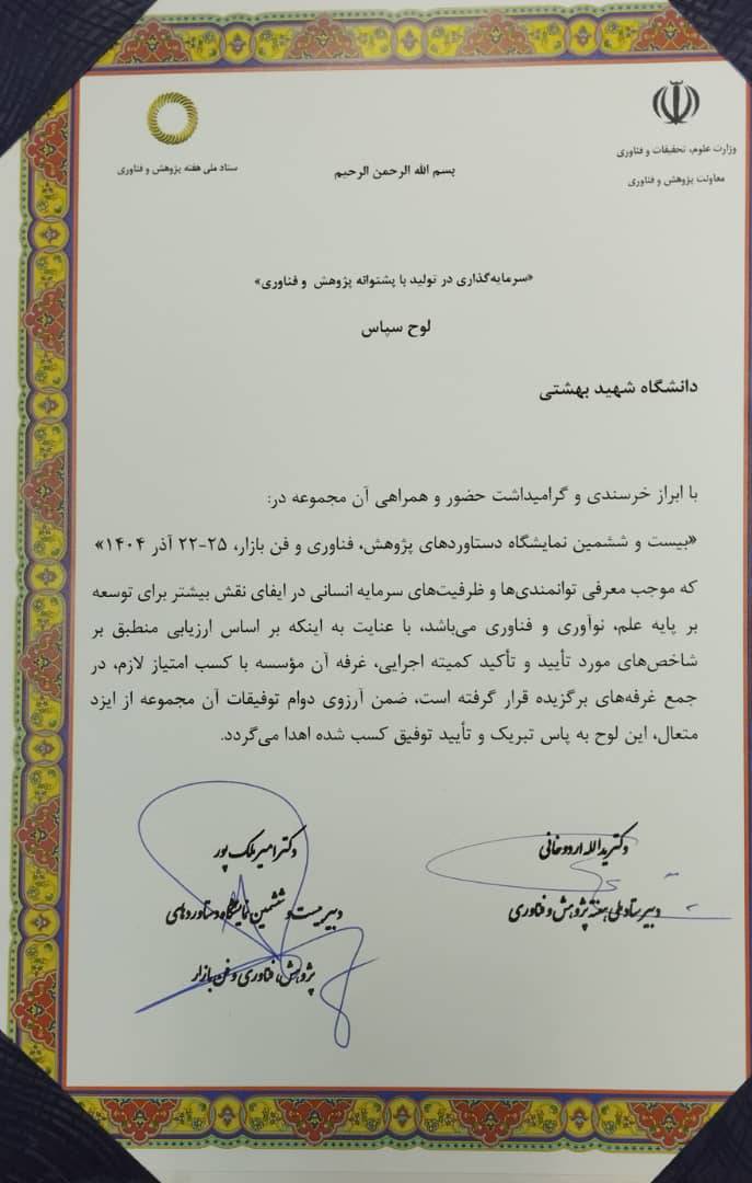 دریافت لوح تقدیر دانشگاه شهید بهشتی از دبیر بیست و ششمین نمایشگاه دستاوردهای پژوهش، فناوری و فن‌بازار