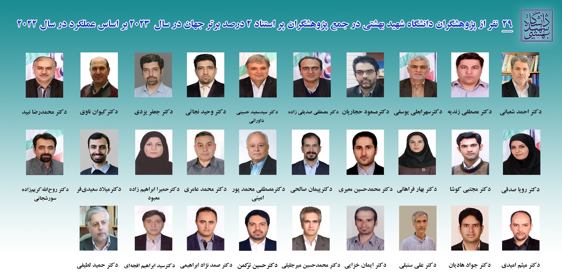 عضو هیأت علمی دانشگاه شهید بهشتی در فهرست ۲ درصد دانشمندان برتر جهان در سال 2023 و 10 عضو هیأت علمی در فهرست دانشمندان دو درصد برتر 2023 بر اساس کل دوره فعالیت معرفی شدند.
